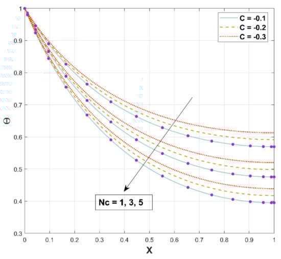 Surface convective heat transmission is involved in the rate of heat transmission and is indicated by the parameter , which has the correlation between the convective and conductive processes. The influence of this parameter on the thermal field is indicated in Figure 9. According to this figure, improving this ratio lowers the temperature distribution. As the convection effect improves, more heat from the fin surface is transferred to the surroundings. The temperature consequently drops as the rate of heat transfer intensifies.