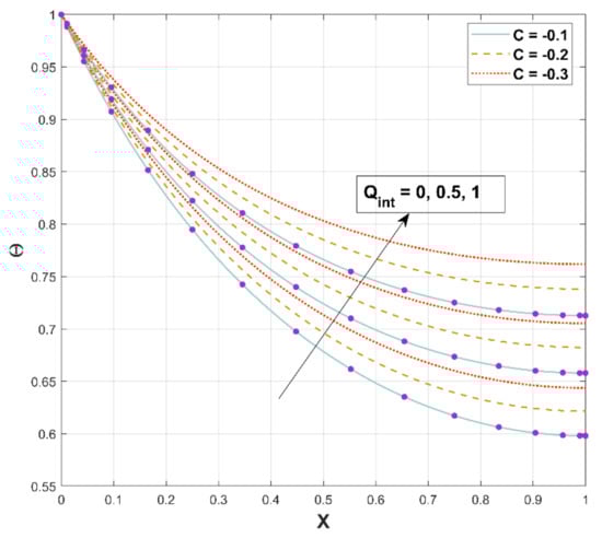 Figure 10 is illustrated to exhibit the impact of on the thermal distribution along the longitudinal axis. shows the upsurge behavior for increased estimations of the heat generation parameter. An upsurge in accelerates the internal heat generation (temperature-dependent), as conveyed in Equation (15). Advanced internal heat generation results in elevated since a greater quantity of heat must be dispersed by the fin to its surroundings.