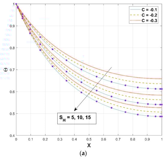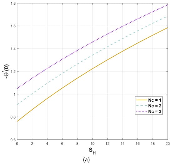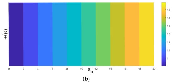 Modifications in the quantity of and porous factor have a consequence on the thermal flux, as revealed in Figure 13a,b. Figure 13a portrays the enriching behavior of heat flux as increases against the porous factor. The heat flux decreases as a component of the porous factor, which is evidenced in Figure 13b.