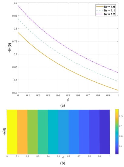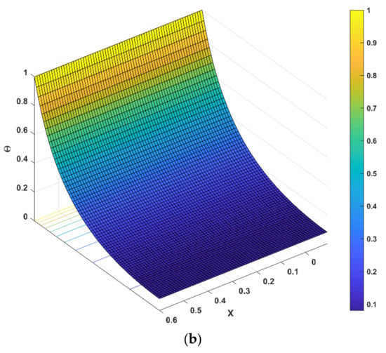 Figure 11a,b represents the relationship between the thermal field and the porosity parameter . When this parameter is increased, the temperature distribution is reduced, resulting in a higher heat transfer rate, as displayed in Figure 11a. When steady-state heat transmission via a fin with porous media is examined under the impacts of natural convection and radiation, it is discovered that porous materials significantly improve heat transfer. Since a permeable fin is composed of pores and solid, heat interaction from the solid part of the porous fin is caused by direct exposure to the environment. The decreasing trend in fin temperature triggered by an increment in the porosity factor is based on the fact that as the porosity parameter improves, so does the porousness of the permeable fin, and thus the capacity of the working liquid to penetrate through the fin pores augments. Additionally, as the buoyancy force increases, more heat is dissipated, which accelerates the fin’s ability to transfer heat. In addition, a three-dimensional illustration is provided in Figure 11b for representing the nature of the thermal field for a specific value of the porous parameter. The energy dissipation rate lowers as the permeability improves, and the porous fin’s efficient thermal conductivity significantly reduces as the solid material is removed. Radiation and convection, on the other hand, improve the rate of heat removal. This variable symbolizes the temperature ratio, and an increase in this factor causes an increment in heat flux.