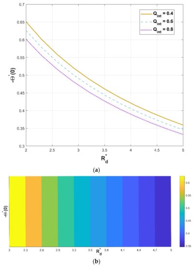For a varying radiation–conduction parameter, Figure 14a,b portray the performance of the heat generation parameter on heat flux. As per Figure 14a, elevating values of significantly decreases the temperature flux against . Greater values of implicate stronger radiative heat transfer and lead to an increase in the temperature profile, which causes less heat flux (Figure 14b).