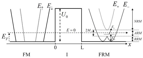 The main points of discussion in this study are the conductance spectrum (Equation (18)) and the spin polarization of current (Equation (19)) of the FM/I/FRM junction, affected by the insulating thickness and the potential barrier height. These two parameters indicate the quality of the junction, which is meant to block the flow of carriers in the off-state condition. Another considered parameter is the electron effective mass, which can be obtained by considering the curvature of the conduction energy dispersion of each material composing the junction. Even though these parameters may not relate to an experiment, we attempt to describe them in terms of their quantitative value.