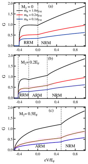 This situation causes the distinguishing characteristic features of the G for the three states as shown in Figure 2b. For is larger than , a strong coupling exchange of the magnetic properties leads to the two states of ARM and NRM as presented in Figure 2c. In the mean time, the G is also suppressed by decreasing the ratio of . Similar behavior of G curve has also been found in previous works of M/FM junction [,]. According to the conductance spectrum of the metal/2DEG with a RSOC junction, the Rashba energy can be predicted directly from the characteristic features of the G vs. curves [,,]. In this paper, the G dependence on the applied voltage in a FM/FRM junction shows interesting features needed to determine the type of Rashba effects in the FRM, such as RRM, ARM and NRM states.
