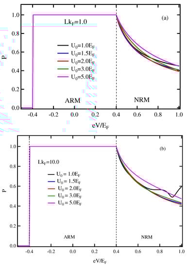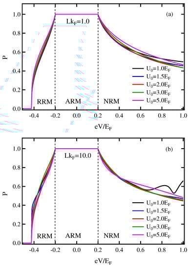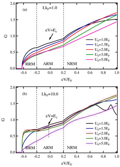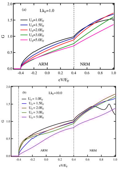 On the other hand, when a thicker insulator and increasing the barrier potential strength are taken into consideration (Figure 3b and Figure 4b), the G in ARM region obviously change non-monotonic behavior. The G obtains a high value under conditions. In the experiment, the optimal layer thickness depends significantly on the electrodes in addition to other parameters, such as the deposition method, rate and the nature of the material [,]. Additionally, the spin relaxation of electrons traveling long distances between electrodes (thick insulator) results in a reduction of the kink at . Inversely, the configuration of this kink can roughly estimate the thickness of the insulating layer in such a junction or magnetic tunnel junction in terms of the thickness or thinness.