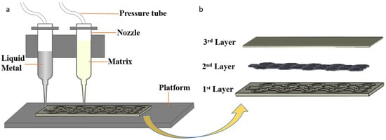 As one of the low melting point materials, liquid metals (LMs) exhibit the properties of traditional rigid metal in a solid state, while it can be dispensed, stretched and deformed easily after melting. With the inherent soft state, LMs are suitable for applications in the devices where the desired materials need to endure varying degrees of stress, such as soft actuators and soft robotics. In addition, the features in high electrical and thermal conductivity can be applied in cases where design stretchable circuits and strain sensors [], such as heat dissipation []. However, the surface tension of LMs is high with approximately 700 mN/m [], that is poor wettability with solid substrates, resulting in the leakage or spillage problems when utilizing devices []. Cheng et al. [] reported that the oxidized LMs have ability to reduce surface tension and improve wettability, but its lower thermal conductivity with around 1 Wm−1 K−1 will deteriorate severely. Until now, to balance wettability and thermal performance, Cu particles have been mixed by various shapes and sizes []. Due to LMs fluidity in the liquid state and inherent brittleness in the stiff state, it is difficult to pattern in the solid form for further processing []. It is possible to introduce direct ink printing (DIW) that is a common approach in the AM field in spite of existing challenges to print LM directly [], so the precise control of distance between nozzle and surface enables the direct printing of non-spherical shapes by shearing metal from the nozzle. As the printed structures maintain a liquid state at room temperature, further encapsulations are required for most applications.