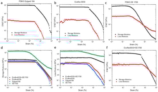 Viscoelastic inversion measurement of (a) PDMS Sylgard 184, (b) Ecoflex 0030 and (c) PDMS SE 1700. (d) The storage modulus and (e) loss modulus versus strain for silicone elastomer. (f) The viscoelastic inversion characteristics of the combination of Ecoflex 0030 and PDMS SE 1700.