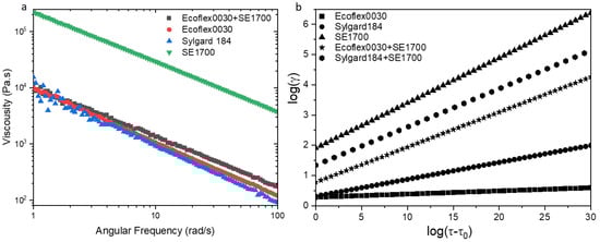 where τ is shear stress, τ0 > 0 is the yield stress, k > 0 is the consistency parameter, and n > 0 is the power index. Figure 3b can be obtained by fitting a linear function by taking a logarithmic relationship to Equation (1), and all value of n below 1. As the increasing of n, the phenomenon of shear thinning becomes more obvious. So, the joint of a certain amount of SE 1700 can effectively make the substrate printable.
