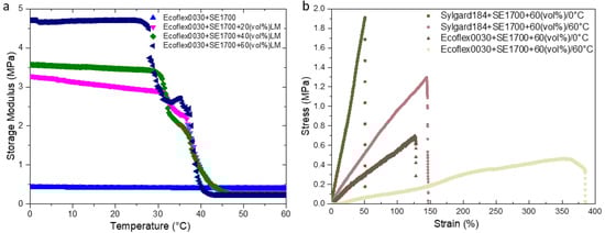 The stiffness is a vital metric for defining the forces changing that the composites can support. After the printed splines are cured (Figure 4a, and the detail dimensions has been labeled in the engineering drawing), a series of DMA measurements have been established that all the tested LM composites are elastomeric in nature. As shown in Figure S4a, the storage modulus of silicone elastomer mixed with Ecoflex 0030 and SE 1700 is smaller than that of Sylgard 184 but greater than that of SE 1700, which is more conductive to highlight the effect of LM additive. So, the former mixed matrix has been focused on, while the latter analysis can be referred to in the Supporting Information section. Despite that LMs possess fluidity in the liquid state at room temperature, the storage modulus of LM composites increases with LM volume fraction (Figure 5a), compared to the unfilled LM composites with 0.429 ± 0.01 MPa, storage modulus at 60 vol% experienced increasing by a factor of around 11 to 4.71 ± 0.1 MPa. The incorporation of liquid inclusions enables to improve the stiffness of polymer composites to a certain extent, which has been demonstrated [,]. In addition, the stiffness is also influenced by the interfacial tension between LM and silicone matrix []. Taking example of the composites with 60 vol%, its storage modulus decreases gradually as temperature rises, but a plunge has been occurred when the temperature reaches the melting point Tm of LM. Such a dip becomes more pronounced as the LM volume content increases, and the change of storage modulus can be over 200% during the transformation between the rigid and soft state. Moreover, the relationship between deformation strain and load bearing of LM composites has been explored by UTM, as shown in Figure 5b. As a result of the solid-liquid transformation taking place below 60 °C, it can be stretched much more than that keeping at 0 °C, particularly, up to 3.5 times for LM (60 vol%) composites mixed with Ecoflex 0030 and SE 1700. Meanwhile, the corresponding carrying load has been weakened due to the soft state of LM. Similar changes occurred in the LM composites with Sylgard 184 and SE 1700 as the carrier (Figure S5).