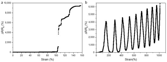 (a) At high temperature (60 °C), the relative resistance changes with the stretchable strain, and (b) the stretch repeatability over time.