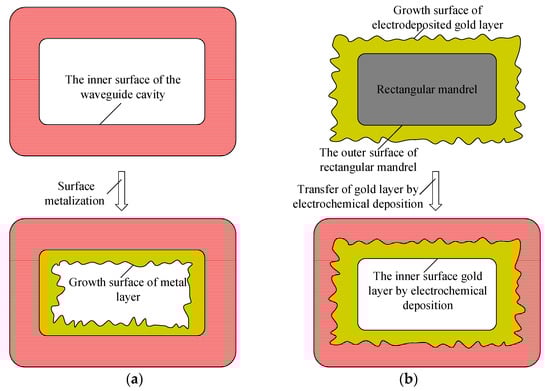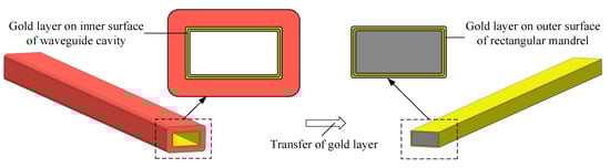 Comparing the morphology observation results and machining measurement results of the rectangular mandrel and the waveguide cavity, the external surface morphology of the former was replicated precisely by the internal surface morphology of the latter, which indicated that the gold layer transfer technology realized the transfer of the gold layer of electrochemical deposition from the growth surface to the non-growth surface.