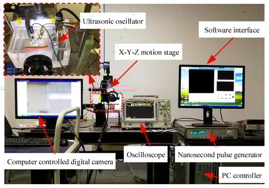 Figure 4. This system comprised an X-Y-Z motion stage, a nanosecond pulse generator (Agilent, Santa Clara, CA, USA), an oscilloscope (Tektronix, USA), a PC controller, a computer-controlled digital camera, and an ultrasonic oscillator, which could realize the function of intermittent ultrasonic vibration. The experimental setup for the gold electroplating and copper electroforming is shown in