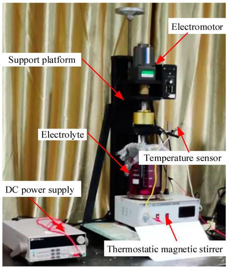Figure 5. This system comprised a support platform, an electromotor, a direct current (DC) power supply (ITECH, China), and a thermostatic magnetic stirrer. In this study, an ultrasonic cleaner was used to perform selective chemical dissolution of the rectangular mandrel.