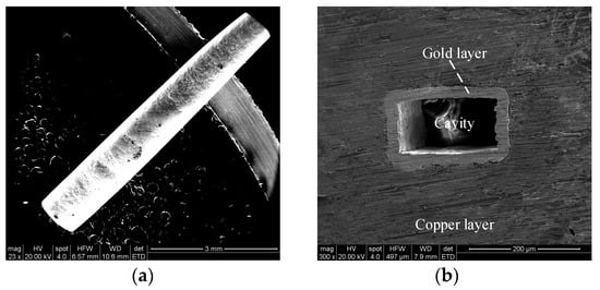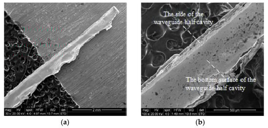 8]. The end-face size of the obtained rectangular cavity was 0.56 mm × 0.28 mm, the thickness of the gold layer was 5 μm, and the surface roughness was 0.5 μm. Ultraviolet-Lithographi Galvanoforming Abformung (UV-LIGA) technology based on SU-8 photoresist is also a representative technology for fabricating terahertz micro rectangular cavity structures. Shang et al. fabricated rectangular microstructures on three pieces of SU-8 photoresist with a thickness of 191 μm and then silver-plated and superimposed the surfaces [