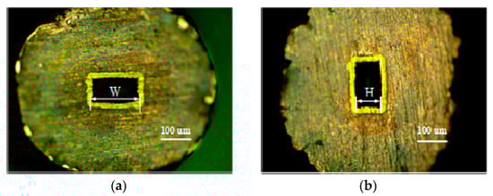 In this study, a KOH solution with a concentration of 1 mol/L was used for chemical dissolution of the pure-aluminum rectangular mandrel. During the dissolution process, the workpiece was ultrasonically vibrated for 60 s every 0.5 h to accelerate the diffusion of the dissolved products. Every 1 h of dissolution, the workpiece was taken out to observe the end-surface topography and determine whether the aluminum rectangular mandrel was completely dissolved. After 6 h of the experiment, the pure-aluminum rectangular mandrel was completely dissolved. A 0.1 mol/L HCl solution was used to clean the workpiece for approximately 60 s to neutralize the KOH solution on the surface.