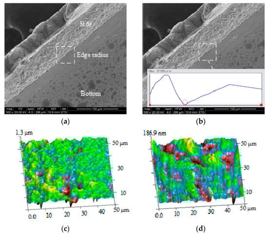 The overall and local topographies of the experimental samples were studied using a scanning electron microscope (SEM, Quanta 200, FEI, USA) and a digital microscope (DVM5000; Leica, Germany). The widths of the rectangular mandrels were measured using the digital microscope. An atomic force microscope (AFM, Dimension Edge; Bruker, Germany) was used to measure the surface roughness of the machined rectangular mandrel and the waveguide half-cavity. A measuring field of 50 μm × 50 μm was adopted in each measurement. The edge radius of the machined rectangular mandrel and the waveguide half-cavity were also measured using the same digital microscope. During the measurement of the waveguide cavity, three workpieces were randomly selected, and five positions of each workpiece were randomly selected in the direction of the end-face width and end-face height for measurement.