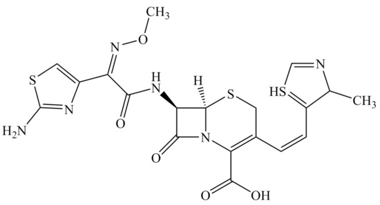 Cefditoren (CFT) is a third-generation cephalosporin antibiotic. This drug is used for the treatment of biotic disorders, including skin infections, palatine tonsils, and acute and chronic bronchitis. It shows antibacterial activities for Gram-negative and Gram-positive pathogens. The dosage of CFT can be 100, 200, and 400 mg. The Cmax, tmax, and half-life are 3.4 mcg/L, 2.0 h, and 1.1 h, respectively. The rapid detection of antibiotics can contribute to antibiotic treatments with favorable clinical effects and a decrease in inappropriate antibiotic usage [1]. The structure of CFT, including the cephem skeleton, is shown in Figure 1.