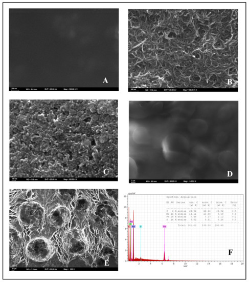 SEM images of (A) bare GCE, (B) MWCNT, (C) Fe2O3, (D) chitosan NCs, (E) MWCNT/chitosan NCs/Fe2O3, and (F) EDX spectra of MWCNT/chitosan NCs/Fe2O3.