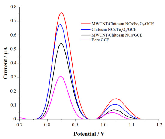Responses of 1 × 10−5 M CFT were recorded using a bare GCE; MWCNT/chitosan NCs/Fe2O3 modified the GCE with the DPV technique, which is extremely sensitive. It was found that the MWCNT/chitosan NCs/Fe2O3 nanosensor significantly affected the electro-oxidation process compared with the bare electrode when the DPV results were analyzed (Figure 3). Moreover, the oxidation peak current of CFT with MWCNT/chitosan NCs/Fe2O3/GCE was 2.5 times higher than the anodic peak current of the bare GCE. Moreover, MWCNT/chitosan NCs/Fe2O3/GCE increased the signal of CFT by accelerating the electron transfer on the GCE surface.