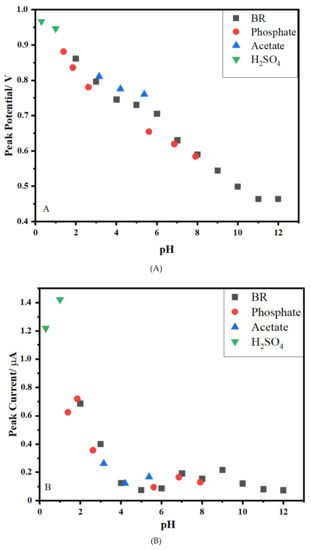 The effect of the supporting electrolyte on the pH was researched using the MWCNT/chitosan NCs/Fe2O3-modified GCE for the determination of CFT. The effect of the pH on CFT oxidation for supply optimum experimental conditions was examined in a range between 0.3 and 12.0 using an H2SO4 solution, a phosphate buffer, a BR buffer, and an acetate buffer with a constant amount of acetonitrile (20%) using the DPV technique. Furthermore, the effect of the pH value on the peak potential (Ep) and peak current (Ip) for 1 × 10−5 M was evaluated for MWCNT/chitosan NCs/Fe2O3/GCE. This nanosensor exhibited the highest peak current value and produced a well-defined peak shape with the 0.1 M H2SO4 solution (Figure 4A,B). Looking at Figure 4A, it can be seen that the Ep and Ip values of CFT decreased with an increasing pH. Hence, the 0.1 M H2SO4 solution was selected as the working medium for studying this nanosensor.