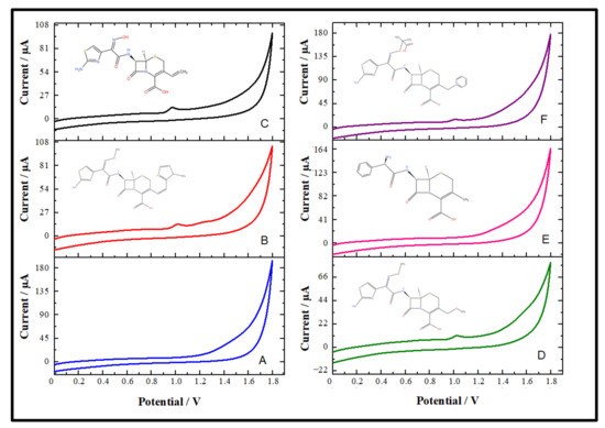 The CV technique is the most significant method for researching the electroactive nature of organic compounds. This technique also assists in brightening the metabolic behavior of pharmaceutical compounds in the biological matrix. The CV technique was used to analyze the electrochemical redox behavior of CFT. The possible electro-oxidation mechanism of CFT was studied with similar model compounds as well as studies relative to the similar electroactive section in the CFT molecule. CFT consists of beta-lactam, aminothiazole, carboxylic acid, and other molecules. Cefdinir, cefpodoxime, cephalexin, and ceftazidime model compounds have similar electroactive moieties to CFT. The CFT signals were compared by conducting CV at a 0.1 V s−1 scan rate using an unmodified glassy carbon electrode with the 0.1 M H2SO4 solution (Figure 5).