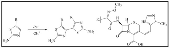 CFT anodic peaks were observed at approximately 1.02 V and 1.20 V. The comparative working of the chosen compounds was undertaken by CV on the unmodified GCE to define the oxidation process of CFT. The anodic peak currents of cefdinir, cefpodoxime, and ceftazidime were observed at 0.97, 1.02, and 1.00 V with 0.1 M H2SO4, respectively. The beta-lactam ring, a common structure, was observed in cefditoren and the model molecules of cefdinir, cefpodoxime, ceftazidime, and cephalexin. The absence of an aminothiazole group in cephalexin led us to believe that the oxidation process might have occurred through this group. However, anodic peak currents of cephalexin could not be observed. That is, it could be suggested that CFT oxidation irreversibly occurred at the aminothiazole ring. The oxidation mechanism proposed by Taşdemir in his study supported this suggestion (Figure 6).