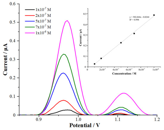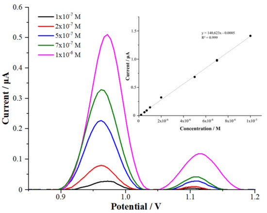 AdSDPV was used to appraise the difference between the anodic peak currents and the CFT concentrations for the MWCNT/chitosan NCs/Fe2O3/GCE nanosensor. The linear concentration range for CFT was determined under optimized conditions with MWCNT/chitosan NCs/Fe2O3/GCE. Calibration curves were obtained in a linear range between 0.2 μM and 10 μM (r = 0.999) by the AdSDPV technique for the MWCNT/chitosan NCs/Fe2O3-modified electrode (Figure 7).