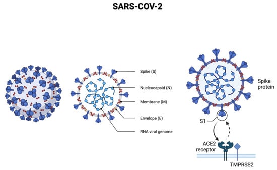 Acute respiratory syndrome coronavirus 2 (SARS-CoV-2), which causes the COVID-19 disease, appeared in December 2019 in China [] and rapidly spread around the world, being declared by the World Health Organization as a global pandemic in March 2020 []. SARS-CoV-2 is an enveloped, positive-sense, and single-stranded Ribonucleic acid (RNA) beta-coronavirus, capable of infecting animals and humans. Regarding its biochemical constitution, the SARS-CoV-2 genome contains around 30,000 nucleotides, encoding structured proteins such as spike (S), membrane (M), envelope (E), and hemagglutinin esterase (HE), and nucleocapsid (N) []. The two SARS viruses’ S proteins were shown to have similar and low nanomolar binding affinities to human angiotensin-converting enzyme 2 (ACE2), the host surface receptor that the viruses exploit to enter cells (Figure 1) [].