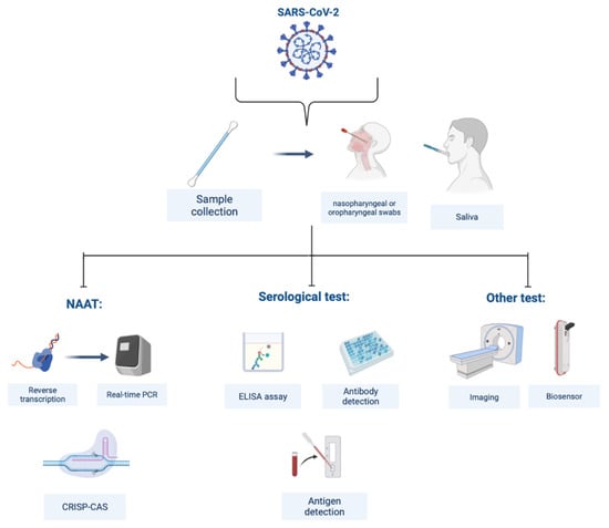NAAT includes loop-mediated isothermal amplification (LAMP), multiple cross displacement amplification (MCDA), recombinase-aided amplification (RPA), CHAnicking and extension amplification reaction (NEAR), and Clustered Regularly Interspaced Short Palindromic Repeat associated (Cas) proteins (CRISPR–CasN)-based assays []. Serological tests can be performed as lateral flow immunochromatographic lateral flow assay (ILFA) [], lateral flow immunochromatographic strip (LFICS) [], chemiluminescence immunoassay (CLIA) [], and enzyme-linked immunosorbent assay (ELISA) [] based on antibody detection. Now, there have been some studies and commercial antigen detection kits for SARS-CoV-2 []. Although the molecular assay is the most common method to diagnose COVID-19, other diagnosis methods have been widely reported: chest computed tomography (CT) scan combined with the evaluation of clinical symptoms [], potential electrochemical (EC) biosensors [], field-effect transistor (FET)-based biosensors [], surface plasmon resonance (SPR)-based biosensors [] and artificial intelligence methods []. Figure 2 represents some of the tests. In order to diagnose various disorders, CT is a frequently employed auxiliary detection technology. The diagnosis of COVID-19 can be made on the basis of changes to lungs imaging brought on by SARS-CoV-2 infection [].