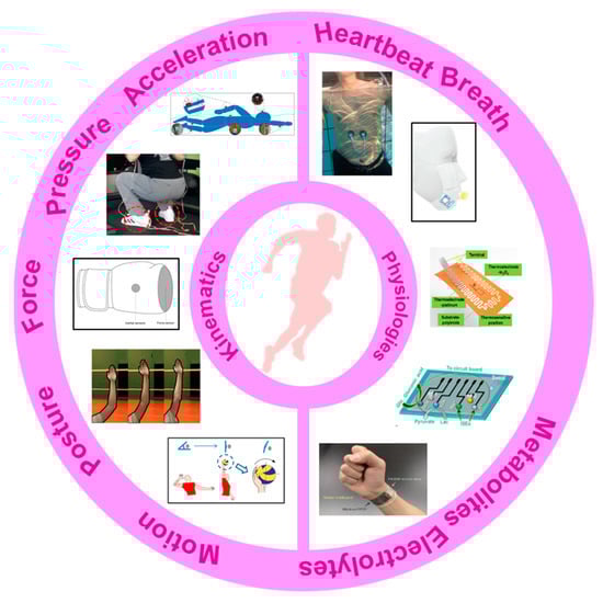 Many excellent reviews have summarized the progress in flexible, wearable sensors, focusing on emerging materials, fabrications, promotion strategies and applications in healthcare [19,20,21,22,23,24]. Additionally, a few reviewing works put their attention on the wearable system in sports. The importance of accelerating the integration of wearable sensors into recreation and competitive sports is discussed [3]. Wearable sensors used in consumer sports and persons with disabilities are also systematically reviewed [25,26]. The devices and analyzing techniques for several kinematical parameters, e.g., motions [27,28], biomechanics of the upper limbs [29] and shock impacts [30], are summarized. Many of these reviews only focus on one aspect of applying wearable sensors in sports, and the mentioned devices are mainly conventional inertial, force/pressure sensors, which lack technique comprehensiveness and relevance to the latest wearable technology. This review, thus, provides a holistic view of recent developments in flexible, wearable sensors in sports. The main concerns of this paper can be found in Figure 1. A brief introduction of the target indicators, from kinematics to physiologies, is described in Section 2. Commonly used flexible sensors for monitoring kinematical and physiological signals are reviewed in Section 3 and Section 4, with an emphasis on the emerging applications of these devices in monitoring the motions and physical conditions of athletes. In Section 5, multifunctional devices for sports are simply introduced. Then, Section 6 briefly discusses the existing challenges and promising solutions for practical researches. The conclusions are provided in the final section.