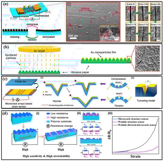 Micro-scale margins for deformation are reserved to meet the requirements of large-range tests. Serpentines, micro-wrinkles, overlapped structures and micro-porousness have proved their significant efficacy in increasing the sensing range. These special configurations can increase the stretchability and reduce the deformation resistance of the structure, allowing the sensor to withstand a larger strain range without being damaged. Most engineered strain sensors can capture strains at around 100%. A porously structured device by Zhou et al. has realized a test range up to 950% with a favorable gauge factor (GF) of 364.5 [87]. Although the tunneling effect of many polymer-filler composites already provides favorable sensitivity, the participation of sophisticated structures is also required to further improve the GF. Taking the crack-based sensor in Figure 5a as an example, the opening and closing motions of crack scarps on thin conductive films will change the cross-sectional area of the conductive path and then affect the resistance of the whole film, allowing the sensors to detect subtle strain stimulus [88]. Moreover, when the separated scarps are on the nanometer scale, the tunneling effect may also exist, giving the electrons a probability to flow across the gap. A nonlinear input-output relationship can be found in most of the crack-based strain sensors. When the strain continues to grow (often larger than 1%), all cracks may be fully opened and the sensing performance also degrades until it disappears. A structurally engineered substrate with strain concentration structures can control the location of the crack and accelerate its propagation, which further improves the sensitivity. For example, abrasive paper pieces have been utilized as a substrate for depositing Au film to form flexible bending strain sensors (Figure 5b) [89]. Some more sophisticated microscale concentration structures, e.g., the tailored V-notches on polydimethylsiloxane (PDMS) film in Figure 5c, can give the strain sensor a GF of 5888.59 at a strain of about 2% [90]. However, it is not easy work to realize a wide-ranged, highly sensitive strain sensor based on only one enhancing method due to the contradiction between the two parameters. Therefore, the hierarchical structures were developed for the improvement of both sensitivity and sensing range. More recently, Li and co-workers introduced both wrinkles and cracks into a strain-sensitive fiber by exploiting a new strain-sensing bilayer consisting of a pre-wrinkled rGO/PMDS layer and a highly susceptible AgNPs layer (Figure 5d) [91]. The robust rGO interlayer cracks the Ag film at wrinkling troughs, and the stress-relief wrinkling characteristic offers the bilayer excellent stretchability. The obtained strain sensor features a large test range (about 210%) and unprecedented GF both in subtle and large strain ranges (0–2%, GF: 420; 110–125%, GF: 1.1 × 109).