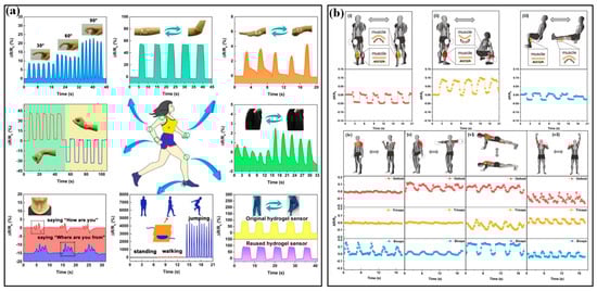 Inspired by the excellent sensing features, strain sensors have played a very important role in monitoring body motions. Generally, human motion depends on the combined action of skeletal muscles, bones and joints. Joint bending usually induces large strains on the corresponding epidermis, which has been successfully tested by a group of piezoresistive strain sensors (Figure 6a) [92]. The distinguished activities include dynamic bending movements in the forefinger, elbow, wrist and knee; making a fist in hand and postures of standing, walking and jumping. In addition to these palpable bendings, many subtle variations induced by muscles also receive excellent monitoring. For instance, the vibrations of the vocal cords in the larynx are accurately perceived when speaking the words “How are you” and “Where are you from”. Muscle contractions are an inevitable part of the exertion in sports and only lead to subtle stretching or contracting strains in the corresponding epidermis. Benefitting from the high sensitivity and high resolution of many elaborate strain sensors, these varied, subtle muscle activities can be easily detected by mounting these strips on skins. As shown in Figure 6b, a kind of fiber-junction bending sensor by Li et al. has completed this task with high quality [93]. The sensor on the epidermis corresponding to calf muscles can identify the magnitude and direction of epidermis strains in three sets of fitness actions, including standing heel lifts, squats and leg extensions (Figure 6b(i–iii)). Based on the captured electrical signal, the squat led to a more significant deformation than the other two fitness actions. Squatting generates a contract strain in the calf muscles and a stretch strain appears when heel lifting and leg extensions are performed, which is the same as the phenomenon observed in real-time videos. Moreover, multichannel monitoring of contractions in different muscles is also investigated (Figure 6b(iv–vii)). Three sensors were attached near the bicep, tricep and deltoid muscles and then simultaneously detected the muscle contractions caused by standing dumbbell curls, side lateral raises, push-ups and shoulder presses. During strain-based monitoring, the crosstalk from external pressure/force may influence the accuracy of obtained results. It is possible to locate the devices in the region that is free from interference, but the limited candidates cannot fulfill the whole monitoring work. A more potential method is making the sensor insensitive to the external undesirable pressure/force. Recently, Xu et al. reported a novel flexible tensile strain sensor that could decouple the simultaneously loaded pressure and was insensitive to the external load-induced off-axis deformations [94]. This integrated sensor patch has successfully detected the activities of fingers and wrists.