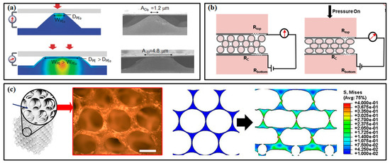In piezoresistive pressure sensors, micropatterned structures, porous layers and multilayered structures have proved their superiority in improving the sensitivity and responding speed [95]. As shown in Figure 7a [96], the deformation of the micropatterned active layer under pressure can more distinctly change the contact area between it and the electrode, which inevitably varies the whole resistance of the device and then improves the sensitivity. Pyramids, domes and semi-cylinders have been widely used for micropatterning the active layer. The semi-cylinder lines can generate a significantly higher rate of increase in contact area than the other two microstructures within the pressure range of 0–2 kPa. When compressed by higher pressure, the deformation of the microstructure tends to saturate, resulting in a decrease in sensitivity. The multilayered structure can be realized by layering conductive microspheres, in which the variation of contact area can be attributed to the deformation between the microspheres and electrodes (Figure 7b) [97]. The porous layer strategy can change the modulus of the active layer (Figure 7c) [98]. Due to the air voids among these microstructures, the active layer tends to deform and recover more easily. A larger pore can improve the sensitivity, but the more deformable active layer can induce a decrease in the dynamic range of sensors. This phenomenon improves the response and recovery time of sensors and lowers the detection limit. However, it is worth noting that there is no universal optimal design for all piezoresistive pressure sensors, and it may be a tailored process to develop a sensor for certain applications.