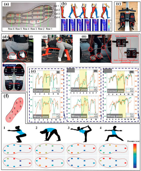 The applications of pressure sensors in sport monitoring: (a) detect and analyze the plantar pressure during walking and (b) the captured results [104]; (c) measuring the plantar pressure on ergometer [105]; (d) monitoring the pressures on hand and foot during powerlifting in three different ways (i–iii) and (e) the obtained pressure results for right or wrong poses for the corresponding ways [31]; (f) monitoring the pressure distribution under four yoga postures [106]. Reproduced with permissions from Wiley (2021) [31]. Reproduced with permissions from Wiley (2019) [106].