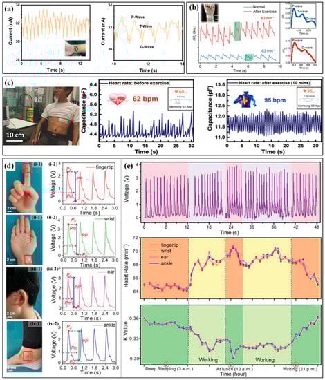 The monitoring of heartbeat and pulse can be implemented by measuring the accompanying physical parameters caused by these activities, which can be detected by highly sensitive strain or pressure sensors. Pulse detection methods can be categorized according to the location of the mounted sensor. The commonly used ones include CA (carotid artery), DA (digital artery), RA (radial artery), BA (brachial artery) and DPA (dorsalis pedis artery). Based on the structure of pine trees and needles in nature, Yu et al. proposed a self-powered piezoresistive sensor with zinc oxide nanorod arrays on graphene-treated cotton [117]. When worn on the wrist (RA), the sensor can successfully indicate the pulse by the occurrence of generated current peaks with an acceptable deviation in heart rate between the sensor and a commercial smartwatch. When further refining the heart rate-current response, the P/T/D waves are also detected (Figure 10a). The variation of pulse rate before and during exercises are detected by the highly sensitive graphene strain sensor on the wrist [118]. Chen et al. proposed a pressure sensor based on a piece of carbonized crepe paper [119]. As can be seen in the obtained waveforms (Figure 10b), the pulse rates rise in a normal state and after exercise are approximately 63 and 83 bpm, respectively. Moreover, the pressure sensor can also distinguish characteristic peaks of the pulse waveform, which are assigned to the P (percussion) wave, T (tidal) wave and D (diastolic) wave. Nassar et al. also successfully illustrated the detection of the heart rate rising from 62 bpm to 95 bpm after a 10-min run by a paper-based capacitive sensor when worn on the chest near heart (Figure 10c) [120]. As long as the performance meets the monitoring requirements, the sensor can be mounted on different positions of the body to detect the pulse. The self-powered pressure sensor proposed by Prof. Zhong Lin Wang’s group has been directly worn at the fingertip, wrist, ear and ankle, respectively, to continuously monitor the heartbeat signals (Figure 10d) [121]. Several consecutive period pulse waveforms were captured in different segments of a day, including deep sleeping, working, at lunch and night writing (Figure 10e). Based on the waveforms, the heart rate and K value are successfully calculated, and the measured heart rates from different positions show a favorable consistency. Moreover, the K value reflects the change in the characteristics and the area of the pulse transit map, which renders the degree of vascular sclerosis and then the cardiovascular physiology and pathology. Further on, a user-friendly system has been developed with the capability of signal processing, sampling and Bluetooth-based wireless communication. The real-time data can be received and displayed on a mobile phone APP. This is of great significance for the low-cost, real-time assessment of athletes’ heart status and the prevention of cardiac problems such as sudden arrests in sports.