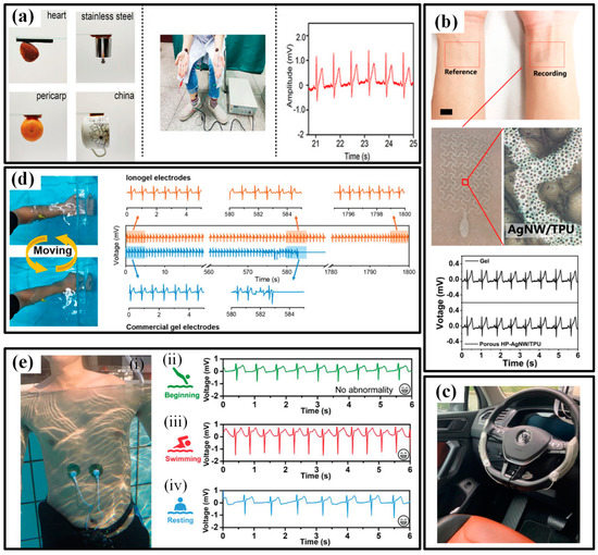 An ECG is another typical signal for assessing the heart state. The research of available wearable devices mainly focuses on pursuing flexible, dry electrodes that can reliably acquire ECG without conductive glue [131]. Numerous high-conductivity nanomaterials, such as metals, carbons and polymers, are processed to guarantee reliable contact between electrodes and skin in various environments. In the beginning, the efforts were devoted to finding candidates to replace the conventional Ag/AgCl electrode. Pencil lead and liquid metal ink are utilized to provide drawability and simplified installation to ECG electrodes [132,133]. The results even prove that the pencil lead-based electrodes could acquire better ECG signals when used under freshwater or saltwater. Then, more and more functional materials are participating in the flexible electrodes to provide favorable features. Gan et al. prepared a super-stretchable, conductive and adhesive hydrogel by incorporating the PSGO-PEDOT nanosheets into a polyacrylamide hydrogel network. Due to the mussel-inspired redox environment inside the hydrogel networks, the obtained electrodes feature a long-term and repeatable adhesiveness, which significantly simplifies the ECG tests (Figure 12a) [70]. Bao’s group compounded a new flexible self-healing material with carbon nanotubes (CNTs) or Ag nanowires (NWs) to obtain a flexible conductive electrode with self-healing capability, possessing great potential in high-viable ECG electrodes [134]. To improve the permeability, porousness is introduced into the electrode geometries [130,135]. Zhou et al. employed a breath figure method to generate the porous skeleton before AgNWs are dip-coated, and the resulting film had a transmittance of 61%, the sheet resistance of 7.3 Ω/sq and water vapor permeability of 23 mg/(cm2·h) [136]. The ultrathin electrode forms a conformal contact with the skin and successfully captures the ECG signals (Figure 12b). Some other researchers are trying their best to extend the application range of flexible electrodes. As shown in Figure 12c, Warnecke et al. attached the printed flexible ECG electrodes to the steering wheel to continuously monitor heart health during driving in different situations, such as rest, city, highway and rural [137]. To maintain functionality underwater, many groups have introduced waterproof capacity into flexible electronics [32,138,139,140]. For instance, Wu’s group prepared an ionogel by a facile one-step polymerization and used it as water-resistant electrodes [141]. The stretchability, conductivity, underwater self-heal ability, underwater adhesiveness and biocompatibility make the ionogel possible to be used as bioelectrodes for underwater ECG monitoring. When the electrodes are continuously shaken underwater with a human forearm, the commercial gel electrode loses the ECG signal within 10 min, but the ionogel electrode is able to record ECG signals continuously for 30 min underwater (Figure 12d). Moreover, the ionogel electrode can maintain its conductivity and mechanical properties and effectively detect ECG signals even after 14 days of immersion in water. Similarly, Ji et al. reported a water-resistant conformal hybrid electrode for aquatic endurable ECG monitoring and achieved the real-time recording of ECG signals during swimming (Figure 12e) [32].
