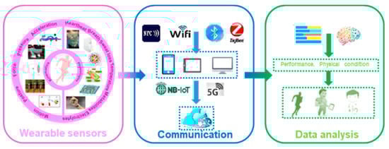 The everlasting pursuit of the “Faster, Higher, Stronger” spirit in sports propels the ceaseless advances of exercise and sports sciences. The continuous breakthrough of human beings in competitive sports is not only due to the advanced training concept but also strongly supported by the high-end instruments for sports monitoring, analysis and evaluation. Many commercially available systems, e.g., video motion capture systems, BSXinsigh, Polar sports tester, Keiser fitness equipment, Xsens 3D motion trackers, etc., have been utilized during exercise to detect and analyze the posture and trajectory of the body and measure the physical information of respiration, heart rate, blood oxygen, blood lactate [1]. The obtained results, acting as a golden standard, can provide data support for formulating scientific plans and preventing fatigue or injuries. However, these existing technologies also have certain shortcomings. For example, the video technology cannot quantitatively analyze the force-generating process, and the common physiological monitoring systems often suffer from their poor wearing comfort, low sensitivity and weak capacity in real-time monitoring [2,3].