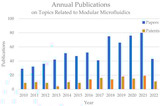 Modular microfluidic technology has received increasing attention from the field recently. Figure 1 shows the annual research papers and patent publications on topics related to modular microfluidics between 2010 and 2022 according to the Scopus and Patentscope databases. The number of related studies on modular microfluidic technology has been increasing rapidly in recent years and has become a hot research topic, while patent applications related to modular microfluidics also exhibited substantial growth in this period, indicating that modular microfluidic technology is developing toward industrialization. In 2018, Fan et al. reviewed the development and applications of modular microfluidic technology [12]. With the rapid development of this field, in this paper, we summarize the current research on modular microfluidics, discuss the infrastructure and characteristics of different modular microfluidic systems, module fabrication techniques, and modularization-enabled application scenarios, and analyze the current challenges and future development trends of modular microfluidic technology.