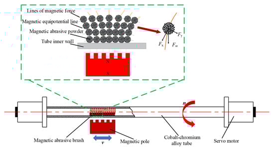 Figure 1 shows the processing principle of MAF on the inner wall of a cobalt–chromium alloy cardiovascular stent tube. The appropriate amount of MAP is filled into the tube, and the gap on both sides of the tube is sealed and clamped on the precision fixture. The MAP in the tube is magnetized instantaneously into a ‘flexible magnetic abrasive brush (FMAB)’ with micro cutting ability under the action of an external magnetic field. The FMAB also has certain flexibility, which can imitate the complex shape of the inner wall of the tube and attach to its surface. The cardiovascular stent tube rotates under the drive of the motor, and the FMAB moves relative to the inner wall of the tube, resulting in friction, cutting, plowing, and other effects on the inner wall of the tube. The removal of the defect layer on the inner wall of the tube is realized, and the surface roughness is finally decreased.