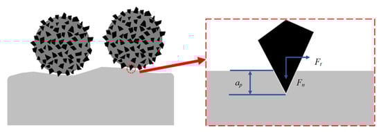 The removal mechanism of cardiovascular stent tube by MAF is the micro-cutting and plastic deformation of the inner wall surface by hard abrasive particles embedded in the metal substrate surface [24]. A schematic of material removal is shown in Figure 2. Under the action of the magnetic field, there is a vertical downward normal pressure, Fn, for the MAP pressed on the inner wall surface of the tube, which makes the hard abrasive produce a certain indentation depth on the inner wall surface [25]. At the same time, the metal matrix in the MAP will also have a good extrusion effect on the surface of the workpiece, which can change the stress state of the tube surface. At this point, the single hard abrasive embedded on the surface of each MAP will bear the normal pressure, Fn, and the tangential cutting force, Ft, imposed by the MAP. The hardness of hard abrasive particles is generally higher than that of processed materials. Under the action of normal pressure and tangential cutting force, the blade tip of abrasive particles will have a cutting effect on the defect layer. In this process, the tube inner wall is removed layer by layer from the sharp convex point. It can be seen that the amount of material removed chanes from more to less and ultimately becomes stable.