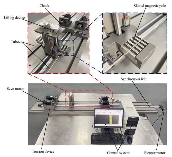 Figure 3 is the MAF setup for the inner wall of an ultra-fine long cardiovascular stent tube. The setup is mainly composed of a clamping system, magnetic field generating system, transmission system, and control system. The servo motor in the clamping system can drive the tube to rotate. The magnetic-field-generation system is equipped with slotted permanent magnet poles. The slotted permanent magnet poles can release a more uniform magnetic field, making the inner wall of the tube more uniform. The transmission system can adjust the position of the magnetic-field-generating system with a stepping motor. The control system adjusts the speed and direction of the tube by controlling the servo motor, so as to adjust the magnetic abrasive trajectory, which is more suitable for the processing of cobalt chromium alloy cardiovascular stent. The feed speed and direction of the magnetic-field-generation system are adjusted by controlling the stepper motor. Each system works coordinately to realize the MAF of the inner wall of the tube.