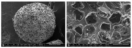 In order to solve the problem of the poor performance of MAPs prepared by traditional methods, CBN/metal MAPs with different particle sizes are prepared by a gas–solid two-phase double-stage atomization and rapid solidification method. This new method can prepare high-performance MAPs with high efficiency and low cost. The molten metal flow flows into the atomization chamber under the action of gravity. In this process, the low-pressure inert gas flow containing hard abrasive particles is first encountered, and the hard abrasive particles break through the molten metal surface. It then encounters high-pressure inert gas flow and is atomized into tiny droplets containing hard abrasive particles [26]. The SEM images of the prepared CBN/metal MAP are shown in Figure 4. It can be seen that the CBN hard abrasive is uniformly and densely embedded on the surface of the iron matrix and that the CBN/metal MAP is ideally spherical. Spherical MAP has special properties such as a micro-edge. In the MAF process, the abrasive particles keep the same cutting depth on the surface of the tube, which greatly improves the efficiency of MAF [27].