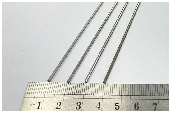 A physical diagram of a cobalt–chromium alloy cardiovascular stent tube used in the experiment is shown in Figure 5, with an outer diameter of 1.8 mm and an inner diameter of 1.6 mm. The composition and properties of cobalt–chromium alloy cardiovascular stent tubes are shown in Table 1 and Table 2. The length of the tube used in the experiment was long. In order to save the experimental cost of the tube, the tube was cut into 500 mm short tubes for each group of experiments.