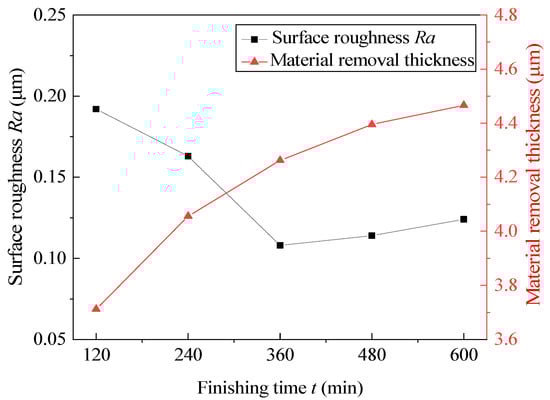 According to the principle of the single-factor experiment, a different finishing time is selected, and the tube rotational speed, the feed speed of magnetic pole, the MAP abrasive size, and the MAPs filling quantity are fixed. The effect of finishing time on the surface roughness and material removal thickness of the inner wall of the cobalt–chromium alloy cardiovascular stent tube is explored. The experimental results are shown in Figure 6.