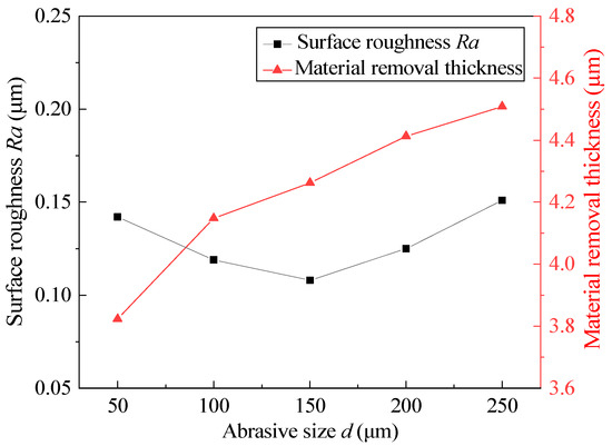 Different magnetic abrasive sizes are selected, and other process parameters are fixed at the intermediate level. The experimental results after 360 min are shown in Figure 9. According to the experimental results, too large or too small of an abrasive size will not obtain low surface roughness; when the abrasive size is 150 μm, the surface roughness reaches a minimum of 0.108 μm. The material-removal thickness increases with the increasing abrasive size. According to Equation (3), under the same experimental conditions, the larger the abrasive size is, the greater the normal pressure on the inner wall of the tube and the greater the indentation depth. In the initial stage of MAF, a larger abrasive size can more efficiently remove the defect layer on the inner wall of the tube. However, when the defect layer is removed, the larger normal pressure causes secondary scratches on the inner wall of the tube again. At the same time, the spiral trajectory generated by the larger abrasive size in the machining process is relatively loose, which is not conducive to more precise machining. However, too small of an abrasive size cannot produce an appropriate indentation depth, resulting in the incomplete removal of the defect layer. Therefore, different abrasive sizes should be selected according to the hardness of the material.