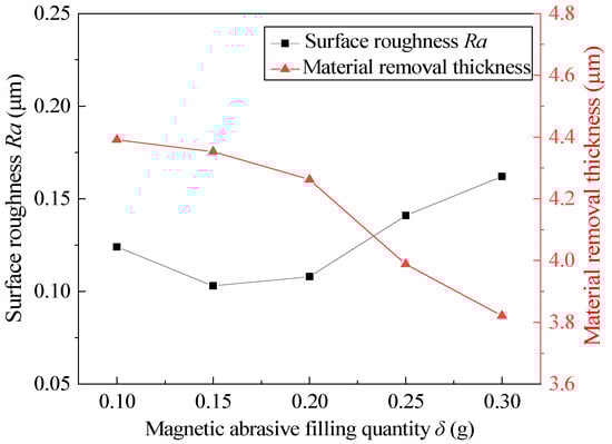 Weighing different magnetic abrasive filling quantities and fixing other process parameters at the intermediate level, the experimental results after 360 min are shown in Figure 10. According to the experimental results, too much or too little of a magnetic abrasive filling quantity can not obtain low surface roughness or suitable material-removal thickness, and the ideal state is achieved when the magnetic abrasive filling quantity is 0.15–0.2 g. When the magnetic abrasive filling quantity is 0.1 g, the material-removal thickness is higher, which indicates that the magnetic abrasive filling quantity is related to the stability and stiffness of the FMAB. When the magnetic abrasive filling quantity is too small, the stiffness of the FMAB increases and the stability decreases, which makes it easy to remove the defect layer of the inner wall of the tube, but it is also easy to scratch the surface, resulting in increased surface roughness. When the magnetic abrasive filling quantity exceeds 0.2 g, the surface roughness and material-removal thickness change greatly. This indicates that too much MAPs results in being prone to clogging in the tube, which cannot better maintain the finishing state, resulting in the incomplete removal of the defect layer. At the same time, multiple MAPs cannot participate in the MAF process, resulting in waste.