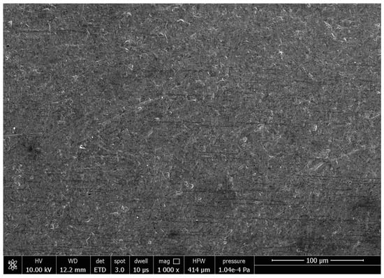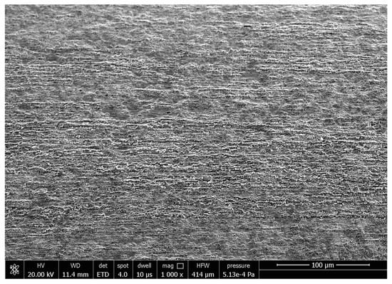 Figure 11 is the SEM image of the original morphology of the inner wall of the cobalt–chromium alloy cardiovascular stent tube. It can be seen from Figure 11 that the surface is relatively rough and that there are obvious pits, folds, and scratches. A cardiovascular stent with these defects may present a risk of secondary thrombosis after long-term implantation. The surface roughness Ra of the original inner wall is 0.485 μm measured by a 3D digital microscope. When the finishing time is 360 min, the tube rotational speed is 900 r/min, the feed speed of the magnetic pole is 150 mm/min, the abrasive size is 150 μm, and the magnetic abrasive filling amount is 0.2 g; the surface roughness Ra is 0.101 μm measured by 3D digital microscope. The SEM image of the inner wall of the tube is shown in Figure 12. It is obvious that the defects in the inner wall of cobalt–chromium alloy cardiovascular stent tubes are removed and the surface becomes smoother, which is of great significance to improving the biocompatibility of cardiovascular stents.