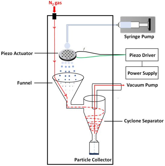 During operation, the feed solution was pushed into the PTFE tubing through the syringe pump at a designated flow rate. The solution exited through the blunt needle showering ~1 cm2 area of the stainless steel (SS) plate with orifice array. The vibration of the plate interrupted the liquid flow into a spray of small droplets. By varying the aperture size and/or vibrational frequency, microfluidic devices enable the tuning of droplet size [48]. Using our set up, a droplet diameter ranging from several to tens of mm can be attained by tuning our experimental conditions. High-purity (99.99%) nitrogen gas was introduced through an inlet atop of the enclosure. The nitrogen flew through the funnel, into the chamber, forming a cyclone, and got pumped away, as indicated by the trajectory in Figure 1 (red line). The gas carried and dried the micronized liquid droplets along the pathway, leading to the precipitation of dry solid particles onto the walls of the chamber and at the bottom of the glass container. The formation of cyclone was essential to assure the sufficient travel path length of the liquid droplets to allow for the drying and formation of solid particles.