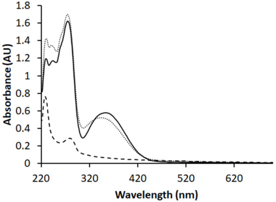 The Flavopiridol concentration in ILDF can be quantified from the spectra at = 358 nm. This peak was selected because there is no overlap with any other components such as in the spectrum of ILD microparticles (see long dash in Figure 5). Following the protocol in the experimental section, the molar extinction coefficient for Flavopiridol is calibrated to be 10,826 , with an absorbance of ILDF solutions measured A = 0.5003. Thus, the resulting Flavopiridol concentration is 4.621 × M, and therefore the loading capacity of Flavopiridol in the ILDF particles was quantified using Equation (1) to be LC = 0.19%. The encapsulation efficiency (EE) in this synthesis was quantified using Equation (2) reached 99 2%. The overall yields, i.e., products/starting materials, consistently reached over 45%. The synthesis process was overall reproducible between batches as the LC and EE were calculated in triplicate from individual syntheses. The robustness was demonstrated by increasing the total feed solution concentration to produce larger particles. Therefore, the synthesis efficiency of our TPMD is very consistent and high.