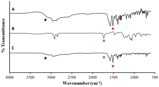 To check and verify the chemical integrity of other components in our ILDF microparticles, ATR-FTIR spectroscopy was acquired. As shown in Figure 6, the spectrum of ILDF is compared with that of individual components of L-isoleucine and with DPPC. The spectrum of the ILDF primarily resembles that of L-isoleucine (A), as evidenced by the characteristic N-H bending, 1514 (red star) [66], and the N-H stretching 3200 (black star) [67]. The presence of DPPC is also clearly proven by the well-resolved C=O stretching mode, 1700 cm−1 [68] (blue star). The intensity is consistent with the fact that L-isoleucine was the major component of our formulation (89.9%), while DPPC (10%) is a minor component.