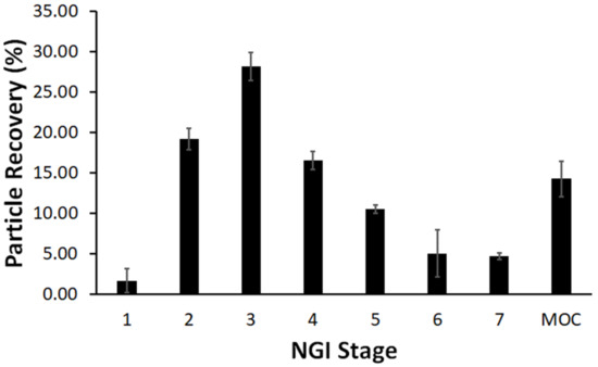 The testing of the aerodynamic performance of our ILDF particles followed the industry’s standard of good practice and was carried out through measurements of EPM, MMAD, FPF, and GSD using an NGI from the emitted aerosol dose from a RS01 DPI. The EPM was measured from the emitted aerosol dose as the average of five capsules with nominal filled mass of 5 mg. The EPM was determined to be 96.5 3.8%, which rivals (and exceeds) commercial products [69]. The measurement of MMAD, FPF (<3.3 m), and GSD were determined from the distribution of fractioned particles in the NGI. The resulting graph of the particle % recovery with respect to NGI stage (n = 3) is shown in Figure 7.